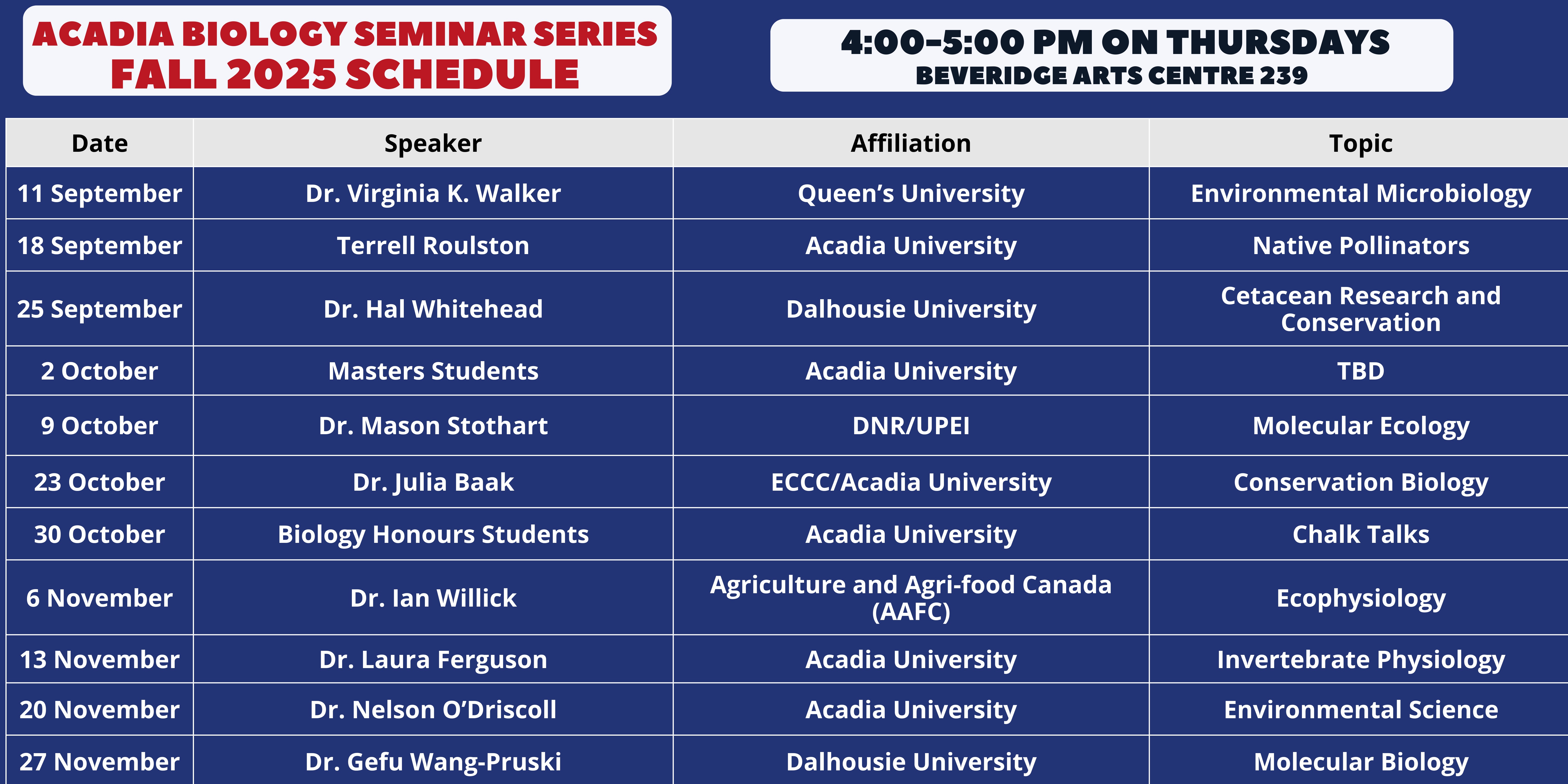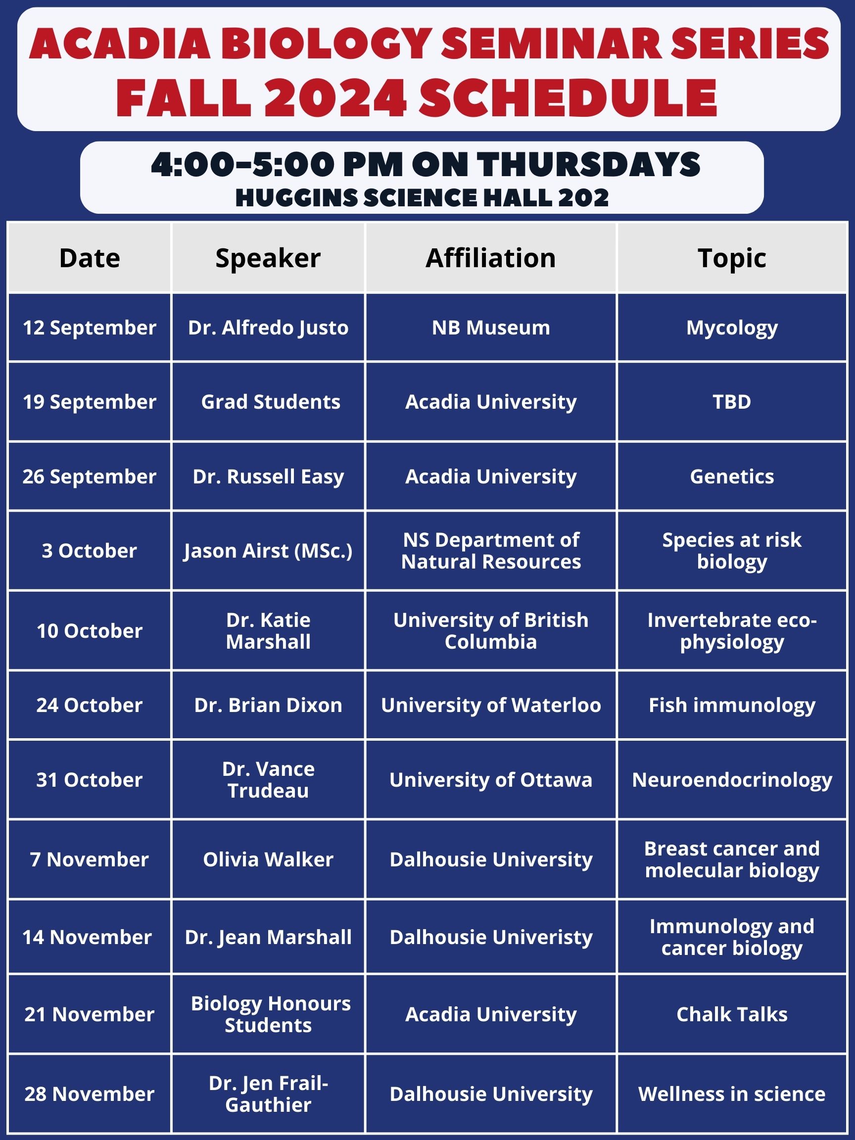 | 16-Sep-2021 | Dr. Laura Ferguson (Acadia/Dalhousie) "Infection, immunity, and the forgotten season: why winter matters for understanding disease dynamics and climate change" |