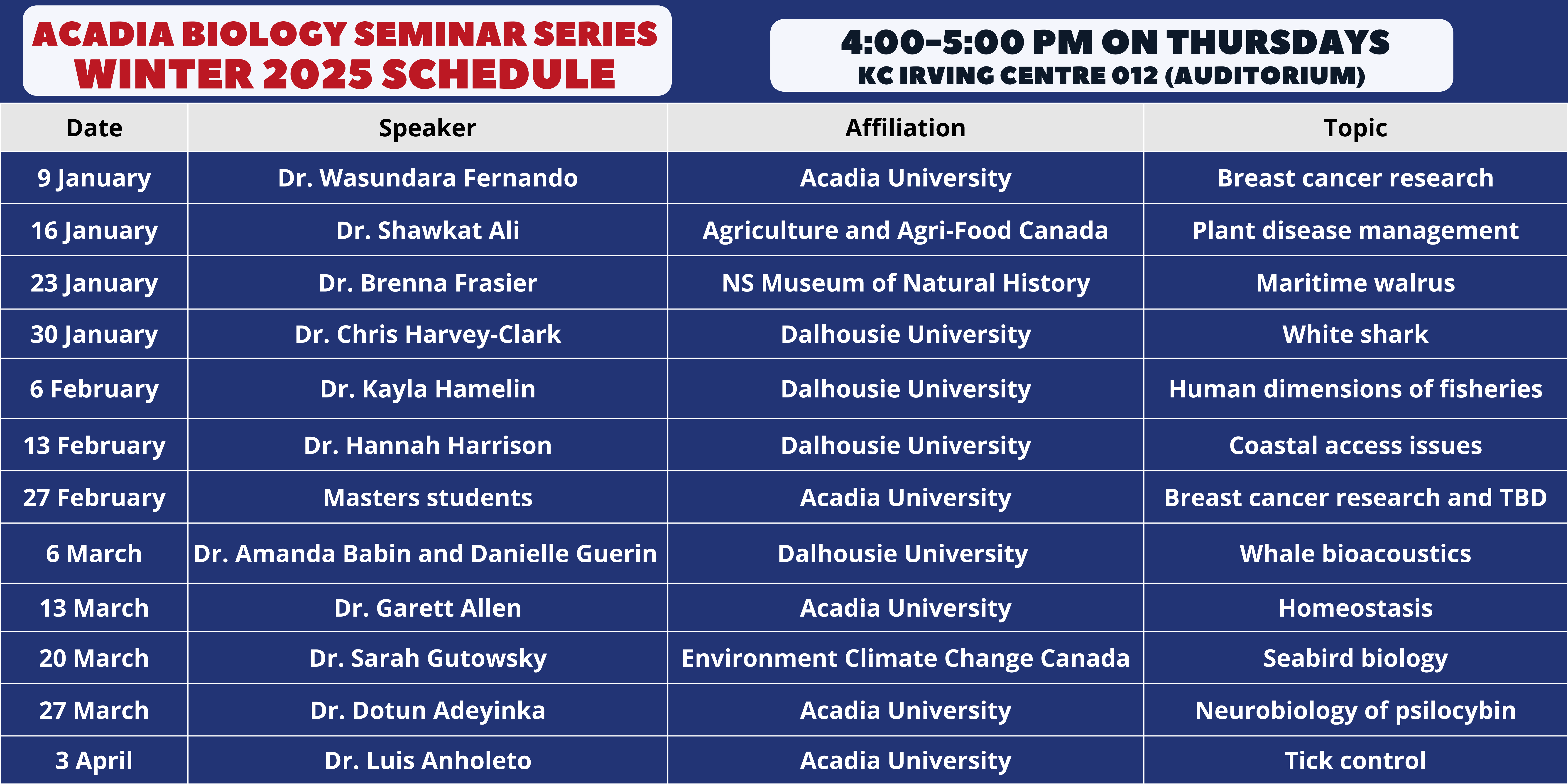 | 2-Apr-2020 | Dr. Heather Hunt (UNB-Saint John) [Cancelled due to Covid-19] "Ecology of coastal benthic communities in a changing ocean" |
