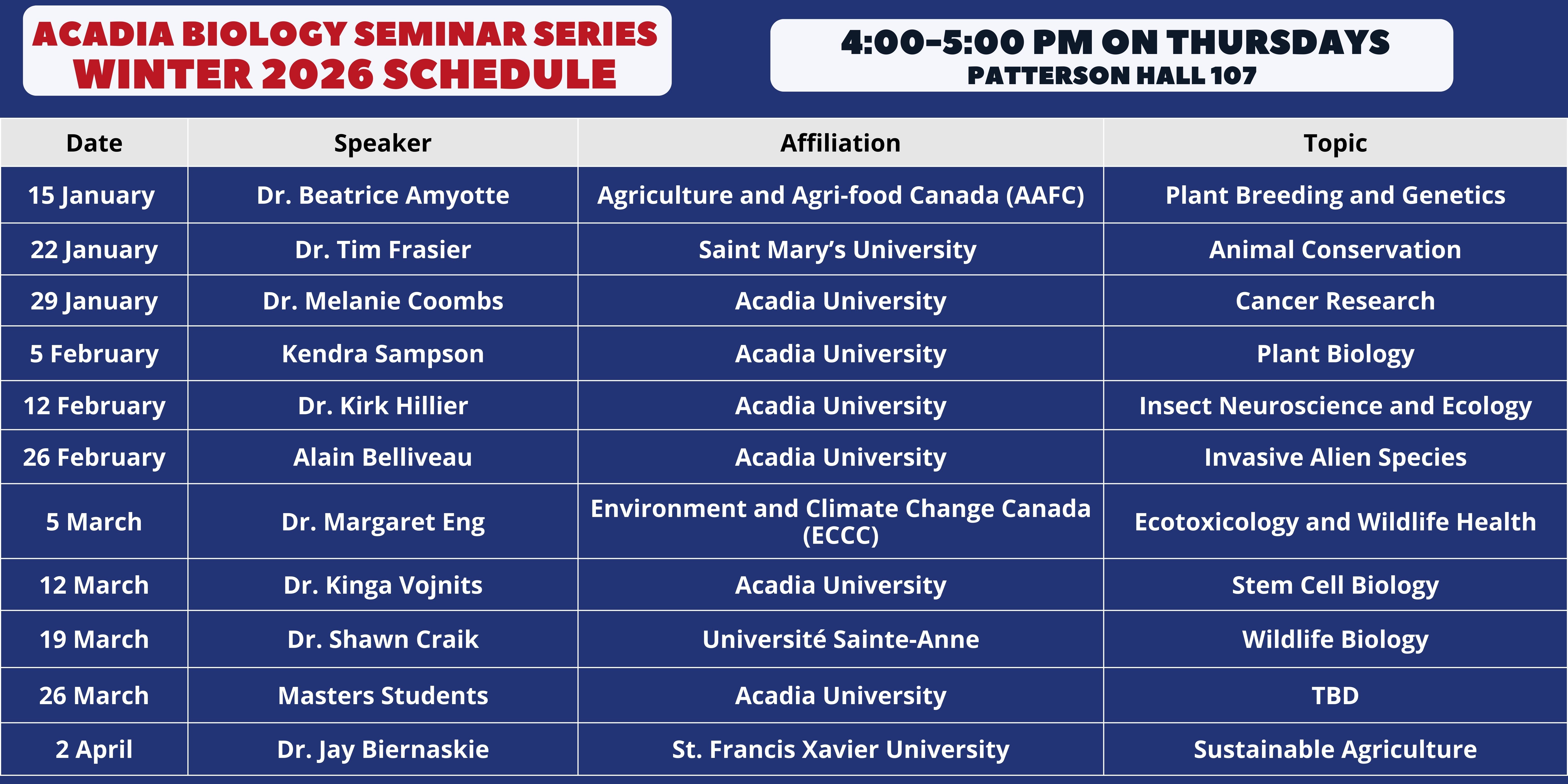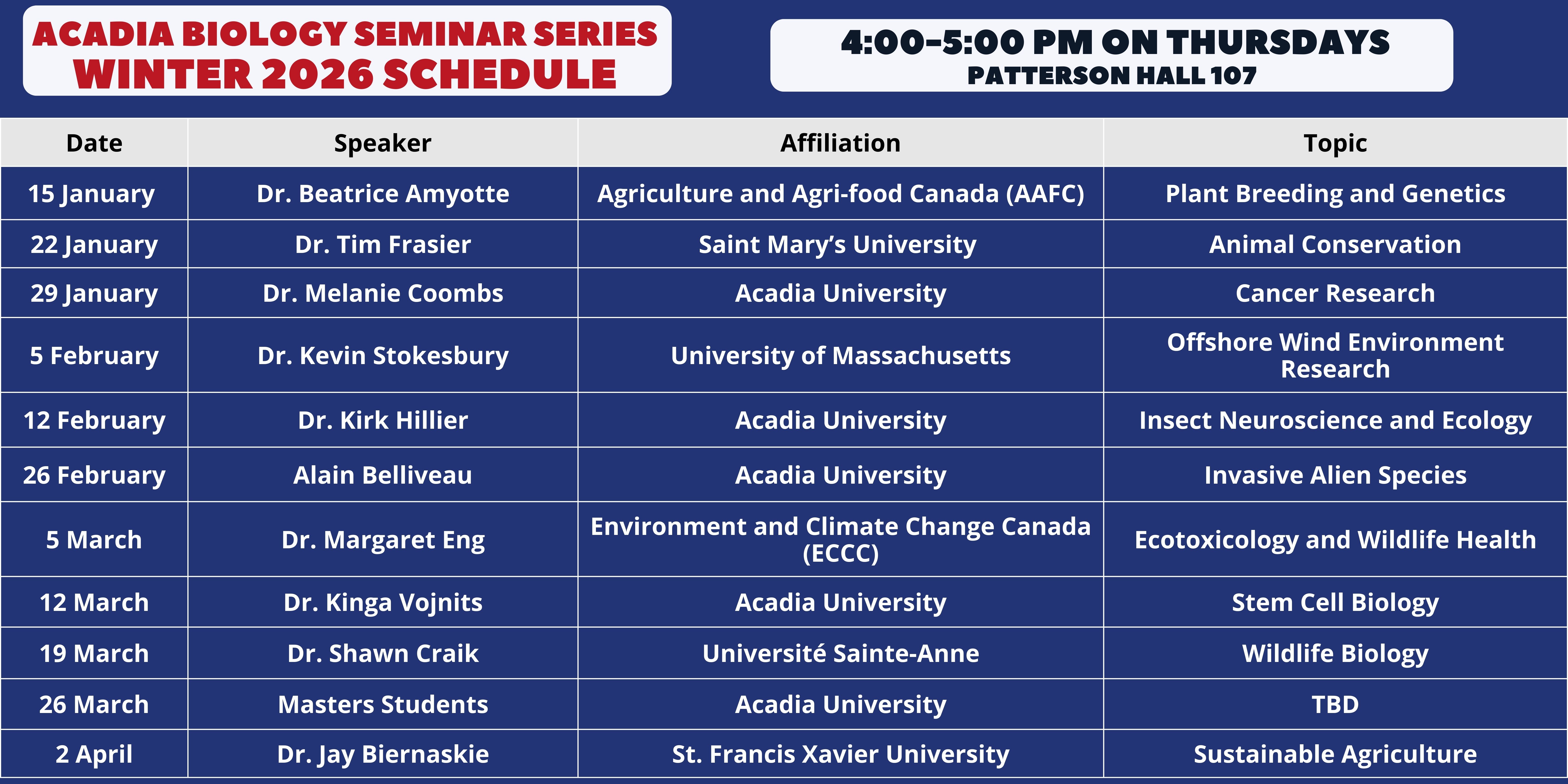 The Biology Seminar Series was started by Dr. Muriel Roscoe and Dr. H.G. Perry in 1927, and has met weekly during term since then. It was formerly known as the Biology Seminar Club. It provides a forum for rich and diverse presentations in biology from esteemed colleagues at Acadia and abroad. The seminar series is organized each semester by a dedicated group of graduate students.